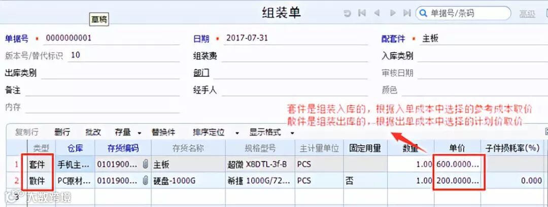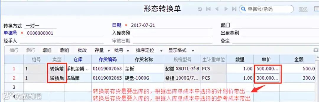 4) 组装单,拆卸单,形态转换单中,出库类型的存货(组装出库,拆卸出库,转换出库的存货)根据出库单成本中选择的方式带出价格;入库类型的存货(组装入库,拆卸入库,转换入库的存货)根据入库单成本中选择的方式带出价格。