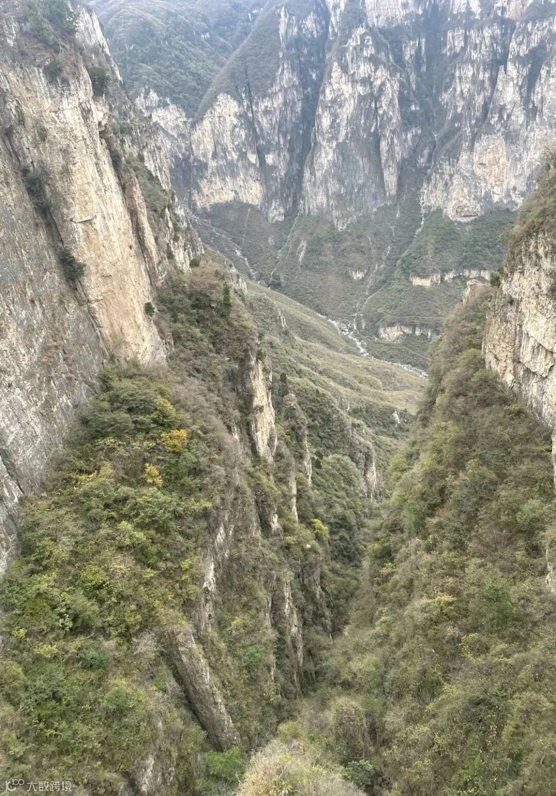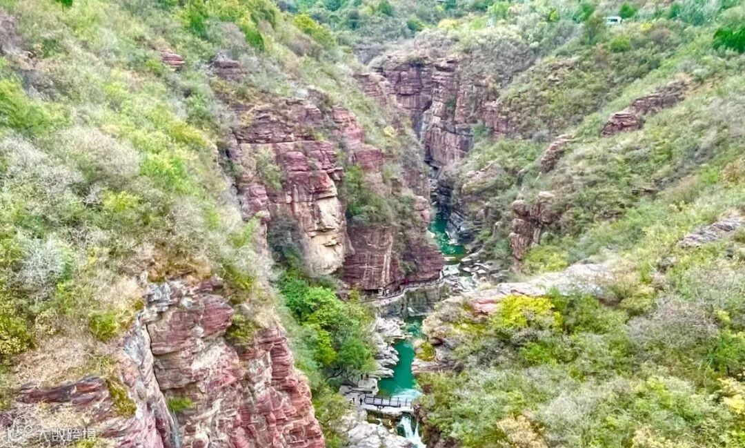 飞瀑流泉翠,悬崖峭壁红。