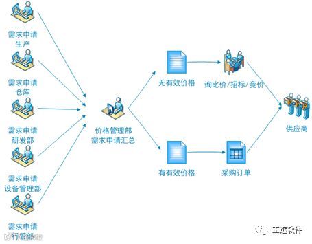 TOPSRM系统里面实行的就是价格策略管理模式,需求申请下达后,系统将智能匹配价格策略,采购员根据匹配情况进行询比价、招标或竞价。主要流程如下: