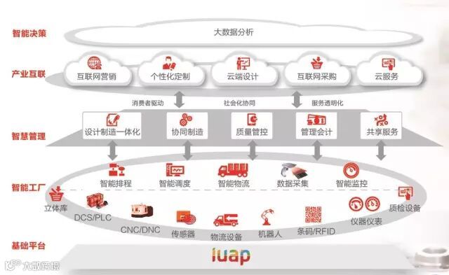 用友基于服务制造企业近30年的行业积淀,提出了5层架构的全局化智能制造解决方案:在基础平台iuap上,构建智能互联的智能工厂,同时向上接通企业智慧管理体系,与产业链上下游互联,最终企业所有数据汇聚云端实现智能分析与决策。