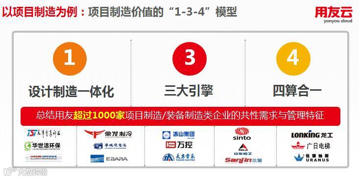 邵志俊强调,内部业务一体化主要是体现在多层次方面,比如项目制造一体化、设计制造一体化、业财一体化等。并以项目制造为例,总结了超过1000家的项目制造类企业共性的管理特征,同时详细介绍项目制造应用价值“1-3-4”模型(1是指设计制造的一体化,3是指3个引擎混合驱动项目管理,4是指从项目的四算合一),突出一体化的必要性和重要性。