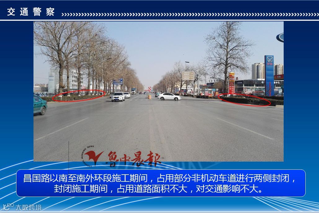 2.封闭施工具体实施方法为:首先封闭两侧机非分隔带,第一阶段封闭计划为3月16日——3月20日,封闭道路西半幅机非分隔带。