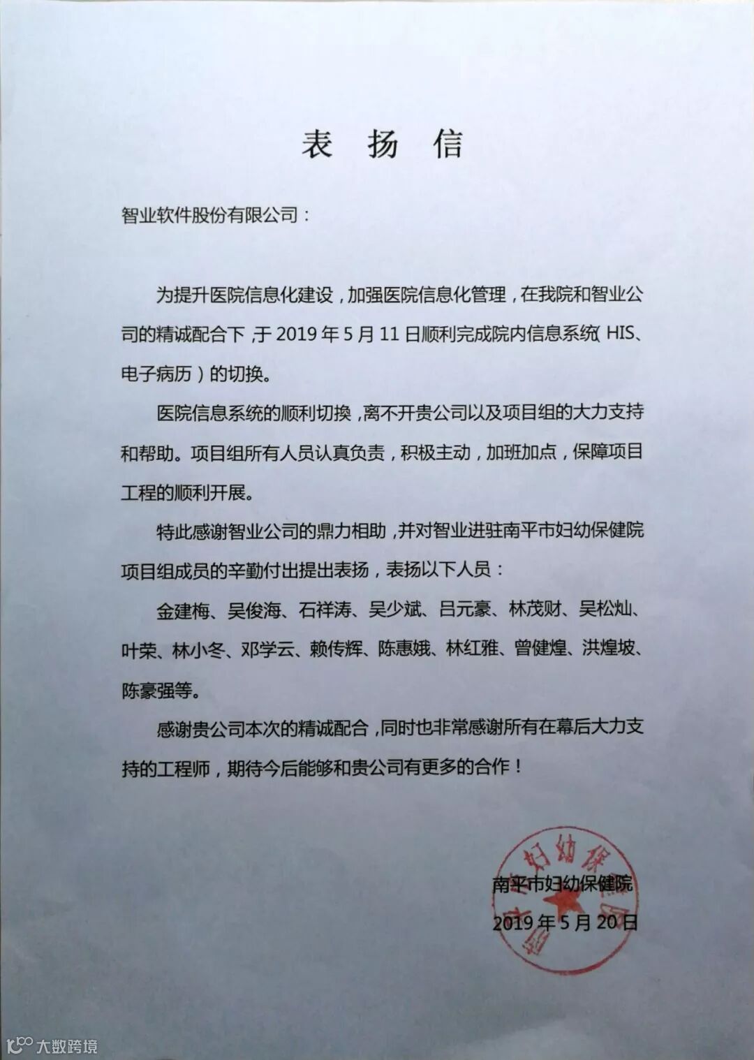 南平市妇幼保健院发来表扬信!