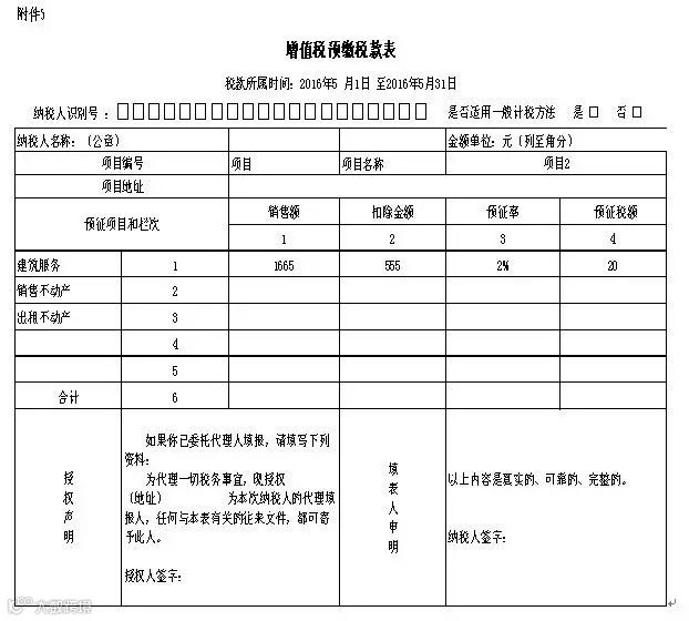 【填写案例六】某A 省建筑公司在B 省分别提供了两项建筑服务(适用一般计税方法),2016 年5 月,项目1 当月取得建筑服务收入555 万元,支付分包款1555 万元(取得了增值税专用发票),项目2 当月取得建筑服务收入1665 万元,支付分包款555 万元(取得了增值税专用发票),该项目公司该如何预缴税款?