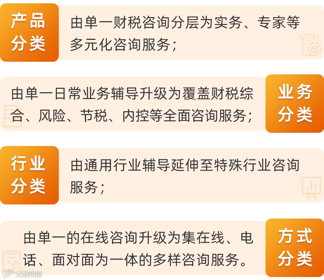 由单一服务人员结合产品特点升级为财税顾问与财税专家两类服务人员;