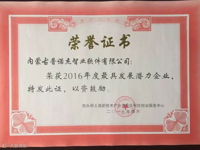 4月27日,包头市稀土高新区创业服务中心(国家级创业中心)2017年工作会议召开。会上,包括内蒙古普诺杰智业软件有限公司在内的8家企业被评为“2016年度最具发展潜力企业”,并受到表彰。