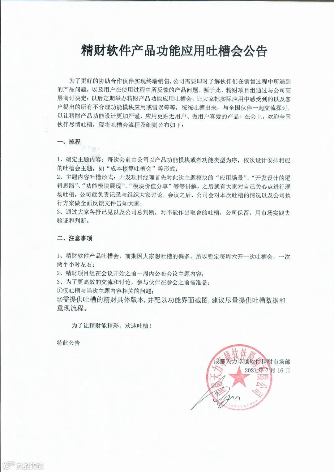 为了更好的协助合作伙伴实现终端销售,公司需要即时了解伙伴们在销售过程中所遇到的产品问题,以及用户在使用过程中所反馈的产品问题。源于此,精财项目组通过与公司高层商讨决定:以后定期举办精财产品功能应用吐槽会,让大家把实际应用中感受到的以及客户提出的所有不合理功能模块应用或错误等等,统统吐槽出来,与全国伙伴一起交流探讨,以让精财产品功能设计更加严谨、应用更贴近用户、做用户喜爱的产品!在会上,欢迎全国伙伴尽情吐槽,现将吐槽会流程及细则公布如下: