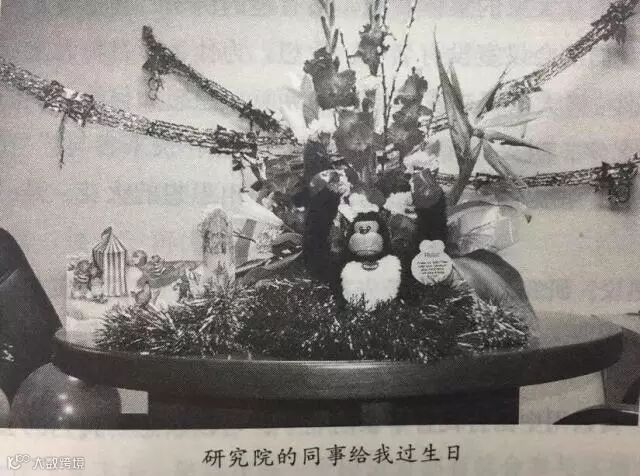 我每年的生日,研究院的同事们都会送一些很别致的礼物。一次,我走进办公室,看见小小的房间里堆满了各种颜色的气球,桌上放着他们送我的礼物——一只很丑很可爱的黑猩猩,猩猩旁边有一张纸条,上面写着:按我的肚子,我就会说话。我按了一下,听到的是他们的祝福,当然,还夹带着一些嘲笑我的话。现在回忆起来,那真是一段值得珍惜的快乐时光,总是让我觉得温暖。