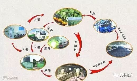 一般认为,循环经济在农业上的应用就是生态农业。最典型的是以沼气为纽带的各种模式的生态农业。如,“猪——沼——果”、“猪——沼——茶”、“猪——沼——菜”、“猪——沼——瓜”、“猪——沼——粮”及传统的桑基鱼塘等等。这只是一个方面。循环经济在农业上的运用有一个更广阔的领域,其实质就是循环经济四个原则在发展生态农业上的运用,称之为循环经济型生态农业。