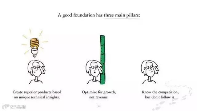 好的策略基础有三根支柱:1、创造基于独特科技洞察的优秀产品;2、为增长而不是利润做调整;3、知道竞争对手的情况,但不随同。