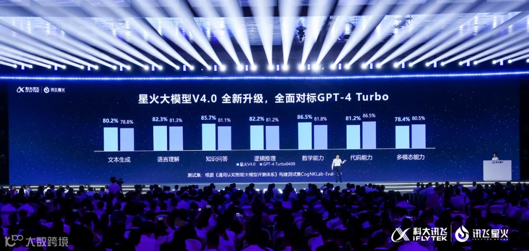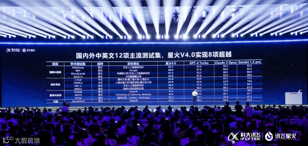 随着新版本的发布,讯飞星火V4.0的七大核心能力全面升级。早在今年1月底,星火大模型发布V3.5版本,在语言理解、数学能力方面就号称超过了GPT-4 Turbo,但代码、多模态等其他能力与后者仍有一些差距。