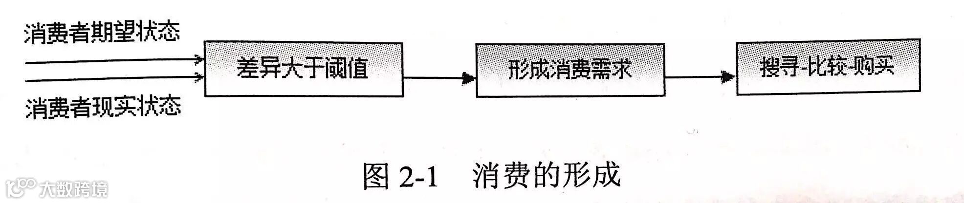 当消费者的“期望状态”与“现实状态”之间的差异大于其内心设定的阈值时,消费者会产生消需求然后通过搜寻和比较,找到自己满意而且符合购买力的商品,最终形成消费,如下图所示,