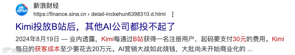 有内幕人士透露,Kimi信息流广告在B站的获客成本一度接近30元/人。