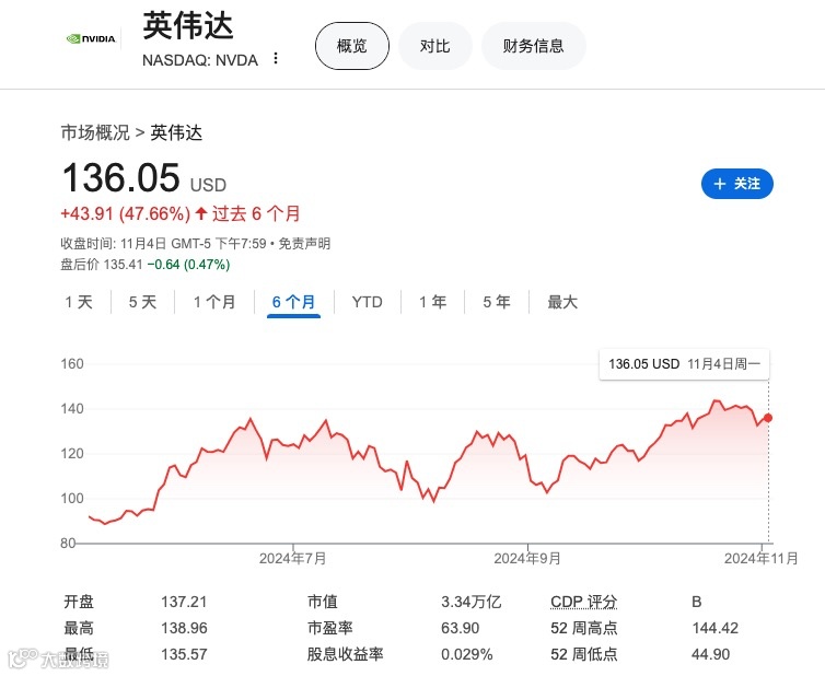 11月4日,英伟达美股当日盘中上涨2.32%,总市值企及3.39万亿美元,超越苹果公司,再一次成为全球市值最高的公司。