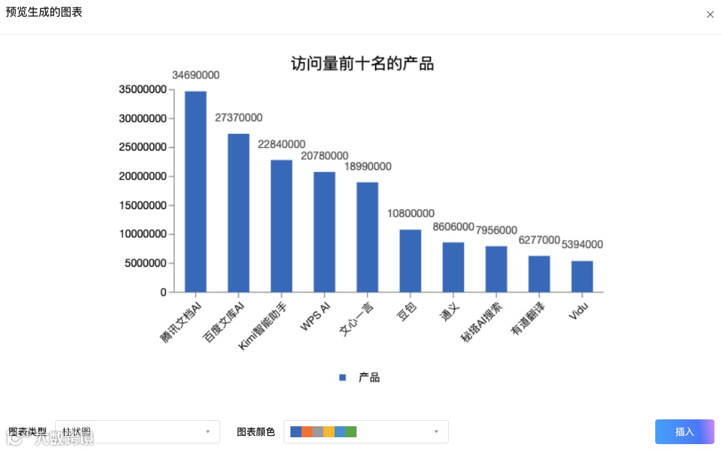 根据我们的数据调研统计,腾讯文档是目前国内SaaS访问量最高的AI办公产品,月访问量超过3000万;同时也是全网使用量最高的AI产品。
