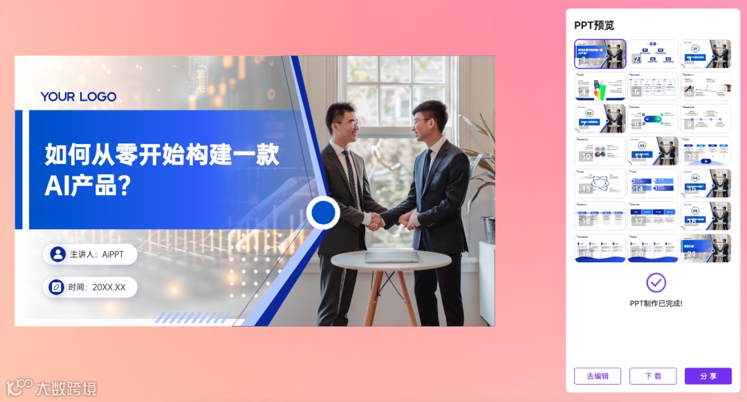 我们将8月份的AI产品榜数据PDF导入百度文库网页端,蹭蹭吐出了一份精美的PPT,连配图都直接创建好了: