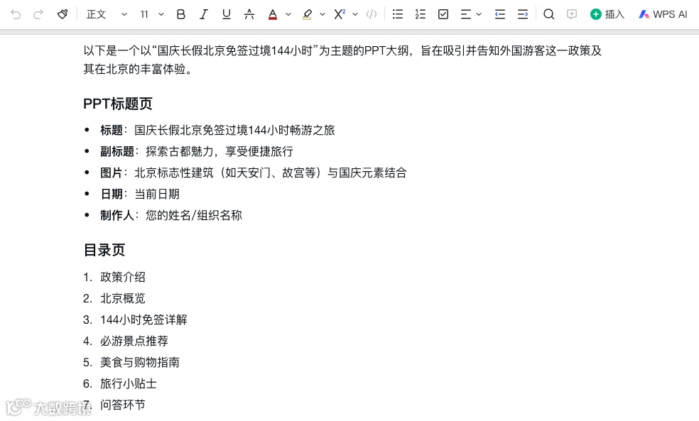 在WPS AI生成的大纲中,非常详实地整理了免签过境政策细则、北京旅行的基本概况与必游景点、北京美食和国庆假期的注意事项等。