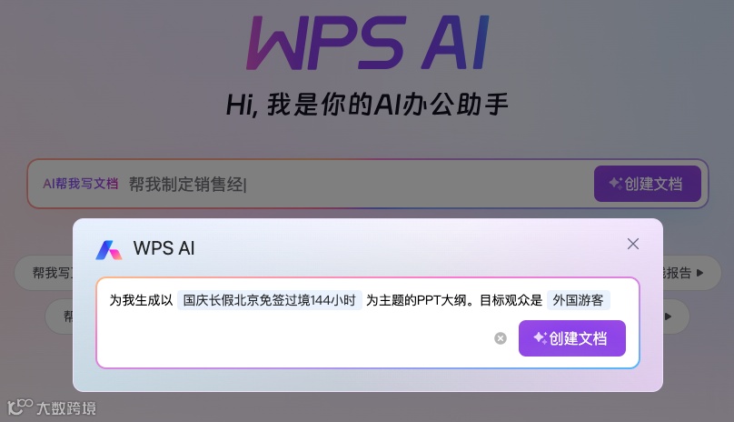 比如,我们让WPS AI帮撰写一份针对外国游客在国庆节经由北京144小时过境免签旅行的攻略方案。