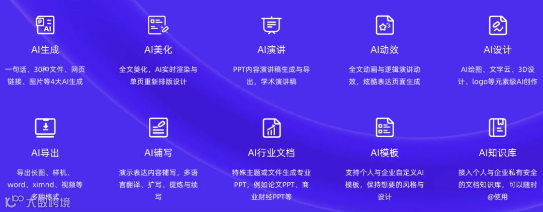 核心功能包括AI生成PPT、AI设计、AI导出、AI演讲档案、AI辅写、AI模板生成等等,针对各种演示文档的应用场景一应俱全。
