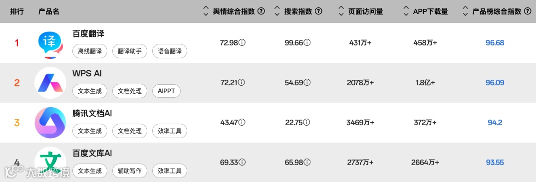 此外,WPS AI在当月拥有2000万+的在线访问量,以及APP月下载量1.8亿的惊人用户数据。与腾讯文档、百度文库一起组成TOP3办公产品“三巨头”。