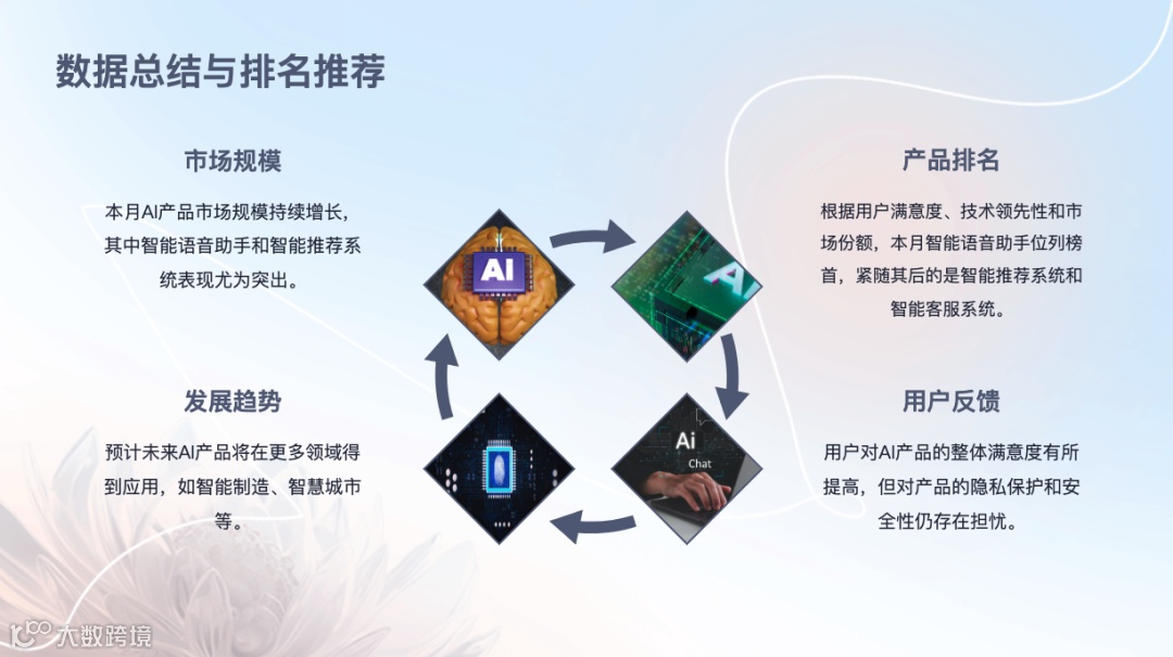AI PPT模版的配色也十分清爽高级,缺点是模版的重复性略高,装饰元素略显单调。