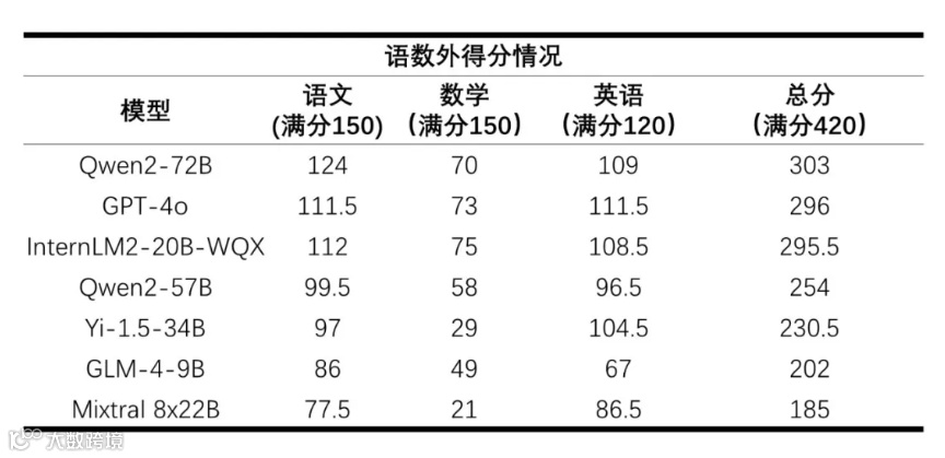 我以GPT-4o的分数为例,「语数英」三科满分420取得296,得分率达到70%。