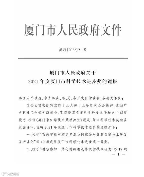 日前,厦门市人民政府发布“关于2021年度厦门市科学技术进步奖的通报”文件,公布2021年度科技进步奖评审结果。