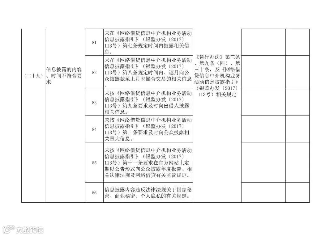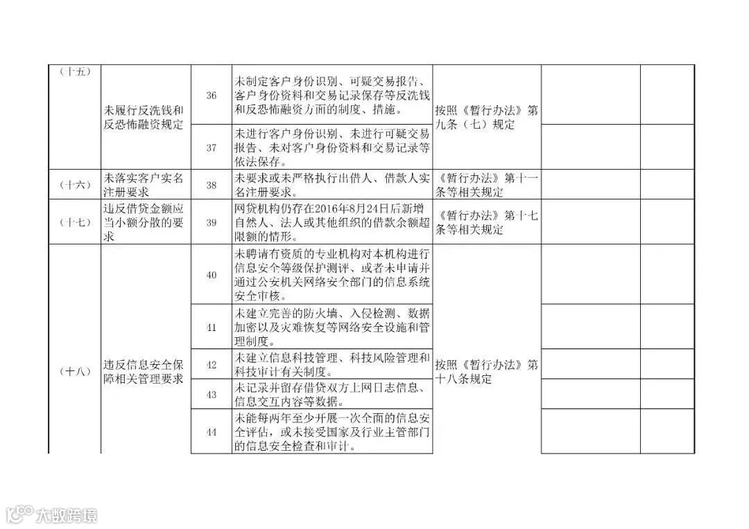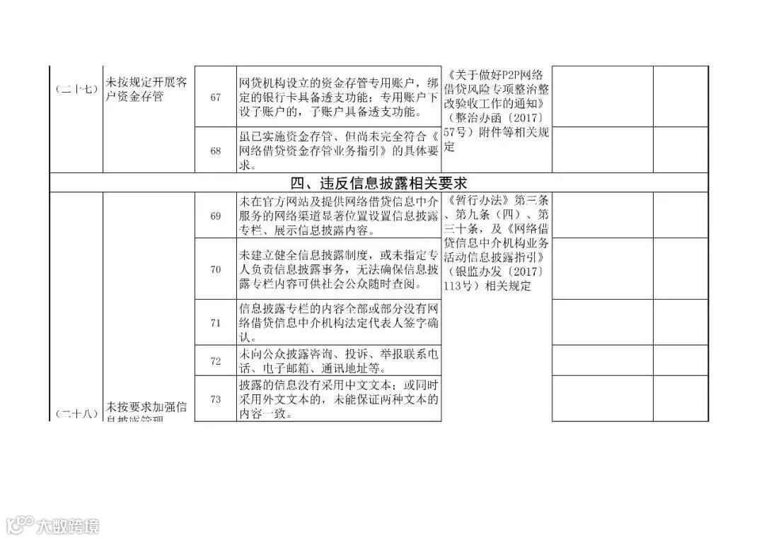 财新记者从多位人士处获悉,近日全国P2P网络借贷风险专项整治工作领导小组办公室(下称网贷整治办)已向各省市网贷整治办下发了开展网贷机构合规检查工作的通知。随着这一通知下发的还有此前市场颇为关注的《P2P合规检查问题清单》(下称问题清单)。