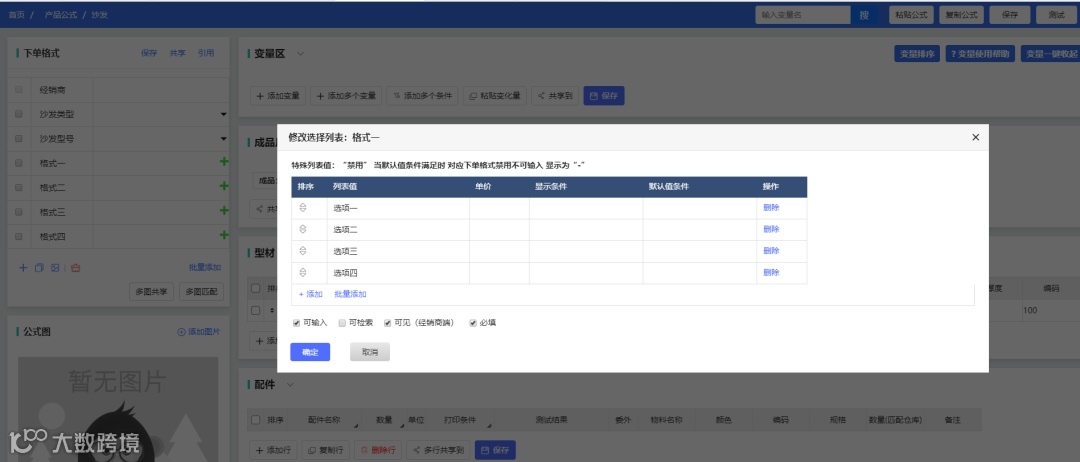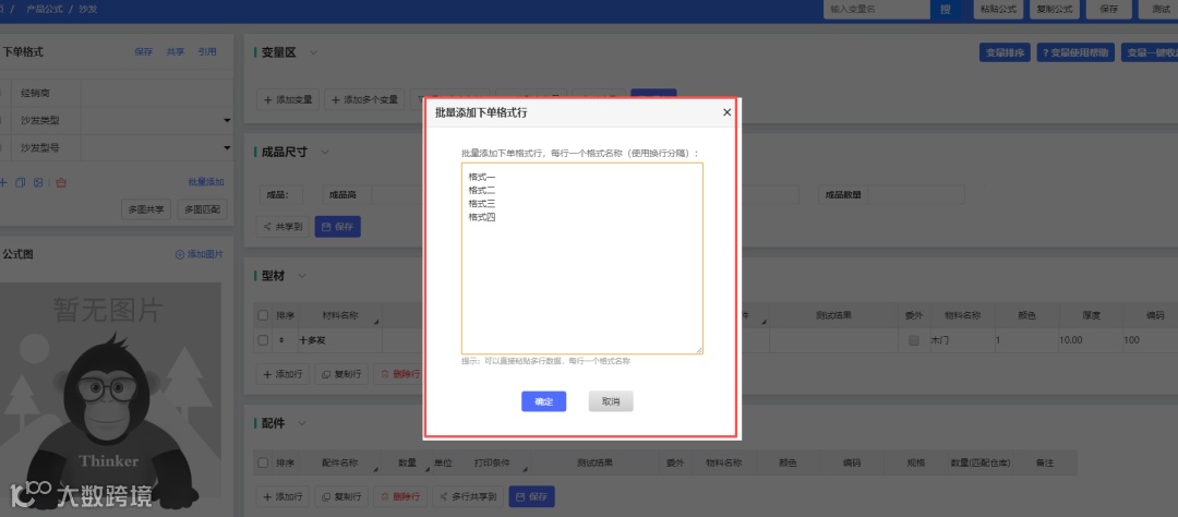 老板良生产管理软件1、产品公式,点击编辑下单格式后,有个批量添加的按钮,添加后,直接按行添加下单格式