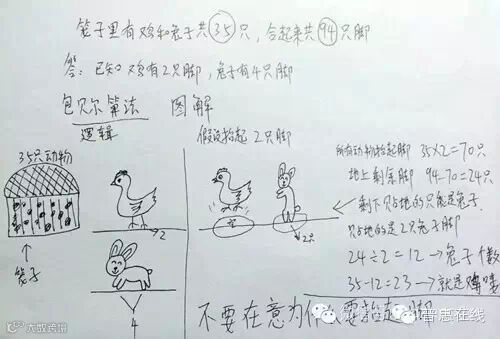 2015.4.27 上周五小编看跑男的时候,看到包贝尔解“鸡兔同笼”问题时说“如果兔子抬起两只脚”,差点儿笑劈叉了。今天在网上看了他的解题逻辑,觉得很赞啊!又直观又简单还好理解!看来“你是猪吗?”这句台词以后包贝尔就可以尽情调戏陈赫了