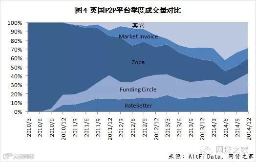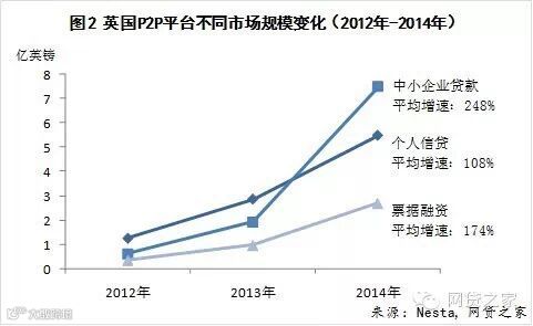 英国的P2P网贷行业近年来发展迅猛,成交量达到15.66亿英镑(23.49亿美元),其中,个人信贷模式平台成交量的年平均增速达到108%,而中小企业贷款模式平台的年平均增速更是高达248%,并于2014年超过了个人信贷模式的年成交量。票据融资模式的增速达到174%,超过了个人信贷模式的增速。