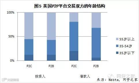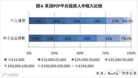 在投资人的收入水平上,投资于中小企业贷款模式的P2P平台的客户年收入半数在35,000英镑以上,而投资于个人信贷平台的客户的年收入更少一些,多数在15,000-35,000英镑。据英国统计局公布的数据,2014年英国人均年收入33,475英镑,最穷的10%的人年收入在14,640英镑以下,最富裕的10%的人年收入超过54,082英镑。相对应的,在P2P平台中年收入15,000英镑以下(近似最低收入)的客户比例分别为17%(个人信贷)和13%(中小企业贷款),年收入50,000英镑以上(近似最高收入)的客户分别是24%和33%。由此可见,英国最穷和最富裕的人都以超出其在人群的比例投资于P2P平台,换句话说,英国中等收入的群体还没有大量投资P2P平台。随着P2P平台产品的成熟,英国的中等收入群体将是最大的潜力客群。