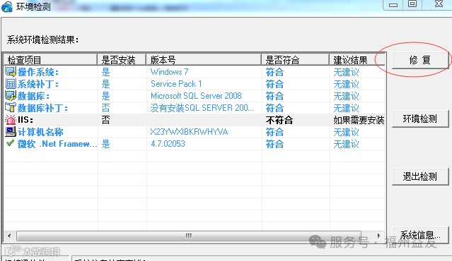 选中不符合就会出现:修复 然后就会自动开始下一步,点击肯定步骤往下一步就可以了,安装完成点击环境检测就会变成符合