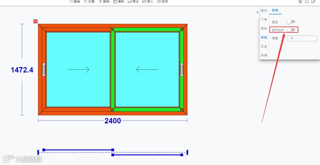 画推拉窗,默认不显示拉手,如图: