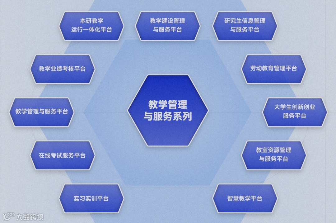 该系列涵盖了高校专、本、研的全流程教学管理。相关产品主要分为培养线(培养方案、学籍管理等)、运行线(教学任务、排课选课等),以及保障线(教材管理、创新创业等)。