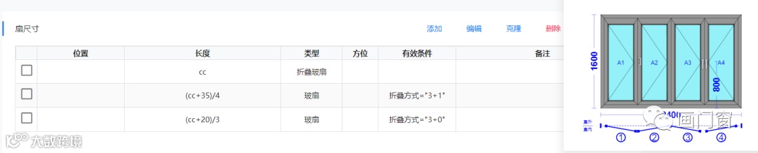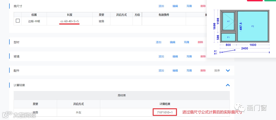 5、下单格式“外框”、“中挺”、“玻扇”增加面宽信息,设置后公式中可使用对应变量(如:外框小面)