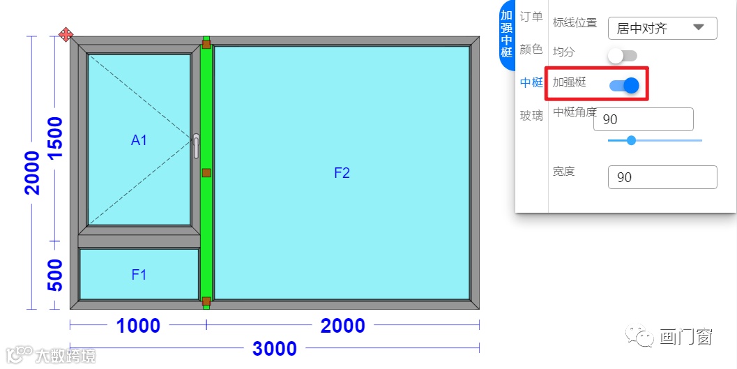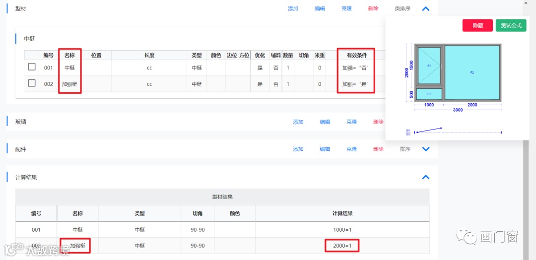 4、支持标记中梃为“加强梃”,智能公式中支持使用“加强”变量(仅针对于加强梃与中梃面宽一致的情况下的解决方案)