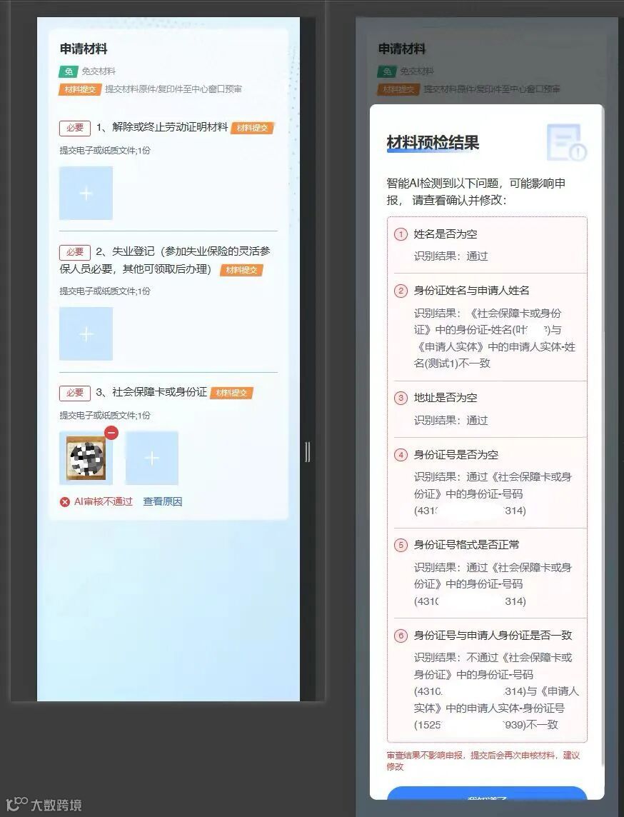 申请人完成表单和材料上传后,AI火眼金睛快速审查,自动扫描材料缺失、盖章模糊等9类高频错误(如身份证复印件反光),实时生成图文修正指南。若有问题及时提醒修改,并在智审通过后推送专属二维码,线下窗口扫码直接调取资料,办理时间压缩至2分钟内,实现“线上一次提交、线下两分钟交件”。