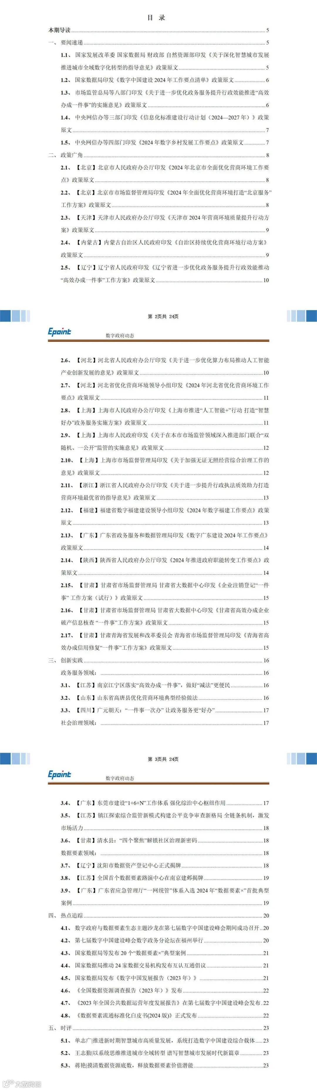 《数字政府动态》2024年5月刊选取国家级、省级重要政策要闻22条,其中国家级政策5条,省级政策17条,主要聚焦营商环境、数字政府、高效办成一件事等内容。国家层面,国家发展改革委、国家数据局、财政部、自然资源部联合印发《关于深化智慧城市发展 推进城市全域数字化转型的指导意见》(以下简称《意见》),整体性重塑智慧城市技术架构、系统性变革城市管理流程、一体化推动产城深度融合,全领域、全方位、全过程推进城市全域数字化转型。地方层面,北京、天津、内蒙古、河北、浙江等地发布了优化营商环境相关实施方案,福建、广东印发的数字政府相关工作要点,辽宁、甘肃印发了“高效办成一件事”的实施意见。