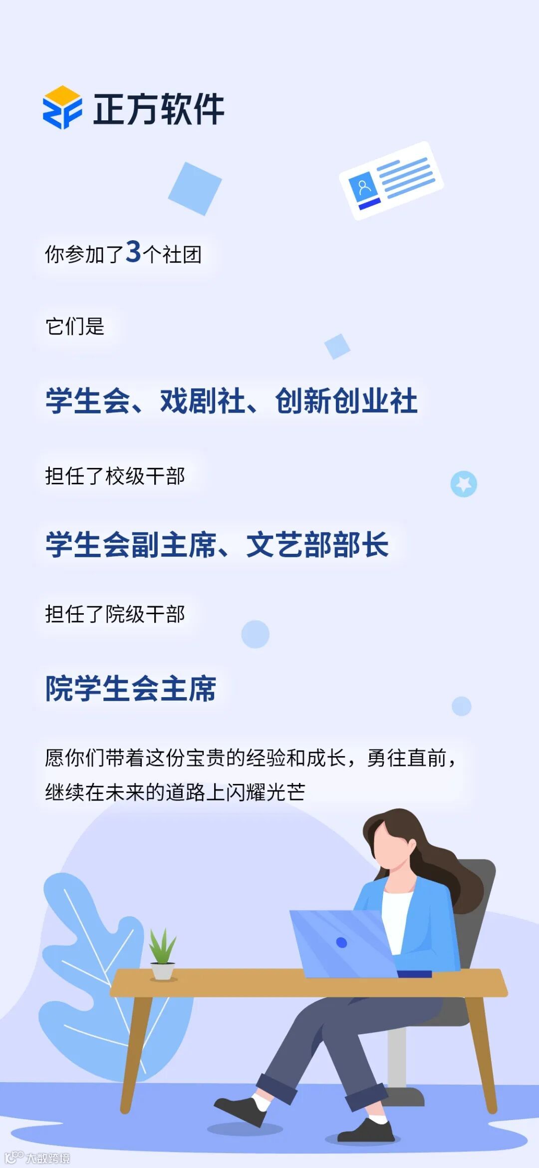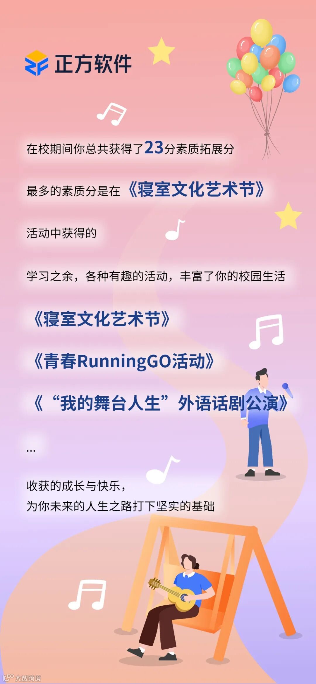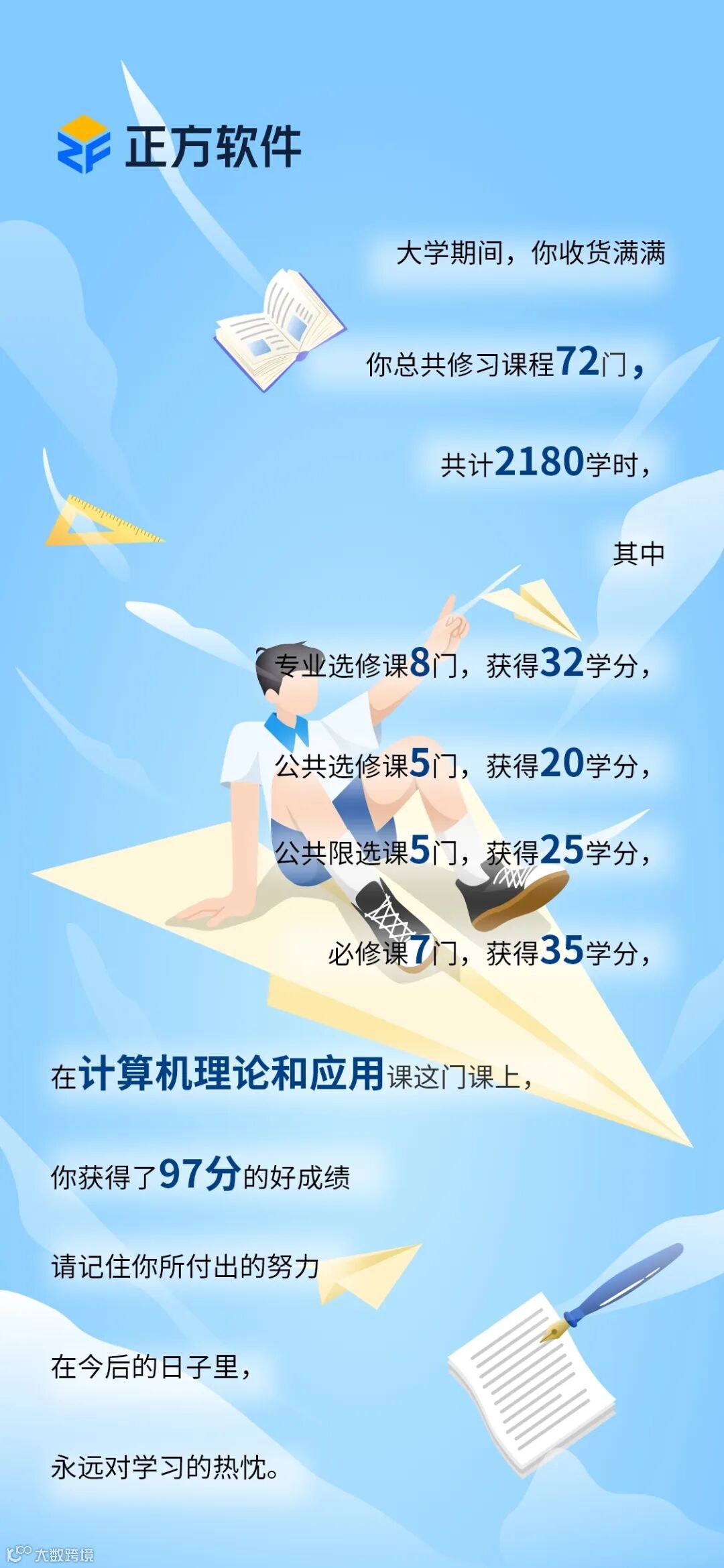 从入学到毕业,每个人的大学生活都是独一无二的。毕业报告会根据学校办学特色、学生个人实际经历,生成一份专属个性化成长报告。通过这份报告,学生可以清晰看到自己的成绩和遗憾,纵览大学成长印记。