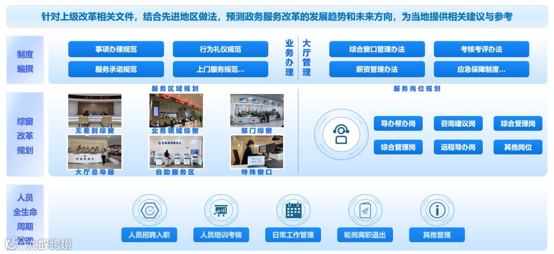 以实现“大厅省心、政府省钱”为原则,“数字化运营服务”为政务服务大厅健康运营量身规划定制一体化“托管式”运行体系,协助制定顶层规范、梳理细化业务流程、纵深推进综窗改革、提供完备人力服务,推动有限资源合理化配置、大厅整体低成本运行,为地区树立便民高效、规范运行、服务优质的大厅标杆。