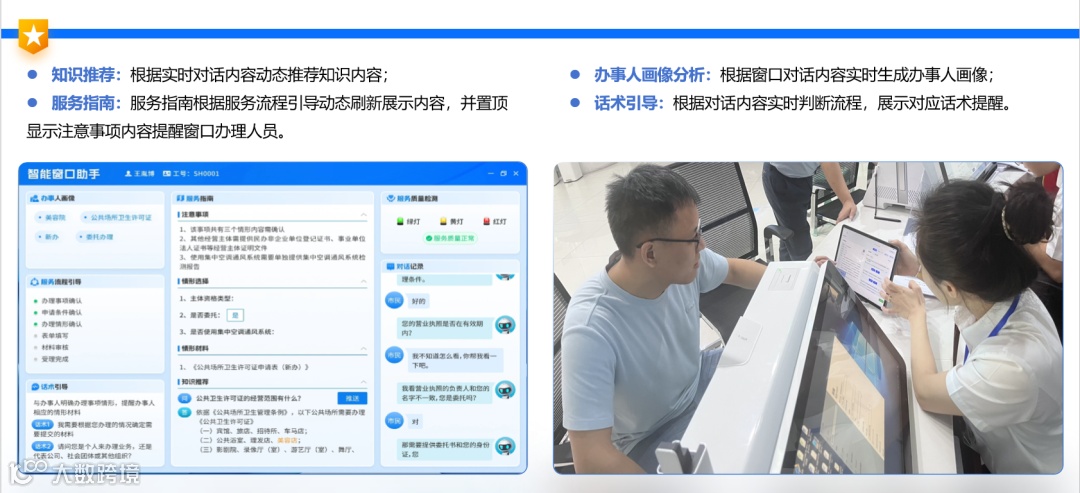 基于大模型意图识别和知识检索能力,“数字化运营服务”打造轻量化智能工具载体,赋能咨询导办、窗口接件等重点业务场景,辅助工作人员化身业务专家“陪您聊聊天”“面对面边聊边办”,变“被动服务”为“主动陪伴式服务”,不仅能解答办事疑难问题,还能根据对话自动识别潜在需要,准确快速地给出最优办理流程和依据,进一步优化整体办事体验,减轻工作人员业务压力,提高窗口人员接件效率,加快整体办件速度。
