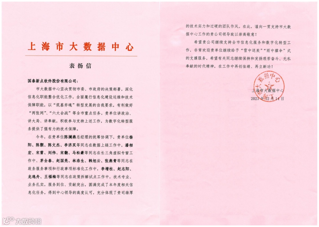 新点软件能够服务上海市大数据中心,支持上海市信息化服务和数字化转型,既是作为上市公司的责任和担当,同时也是践行“智慧城市整体解决方案提供商与运营商”战略愿景的重要实践和重要阵地。新点软件将一如既往保持和发扬艰苦奋斗、无私奉献的时代精神,在未来的工作中扎实努力、勤勉尽责、求真务实、开拓创新,争取再创佳绩,再立新功,不负用户的信任和支持,不负上海市大数据中心的期望和重托。