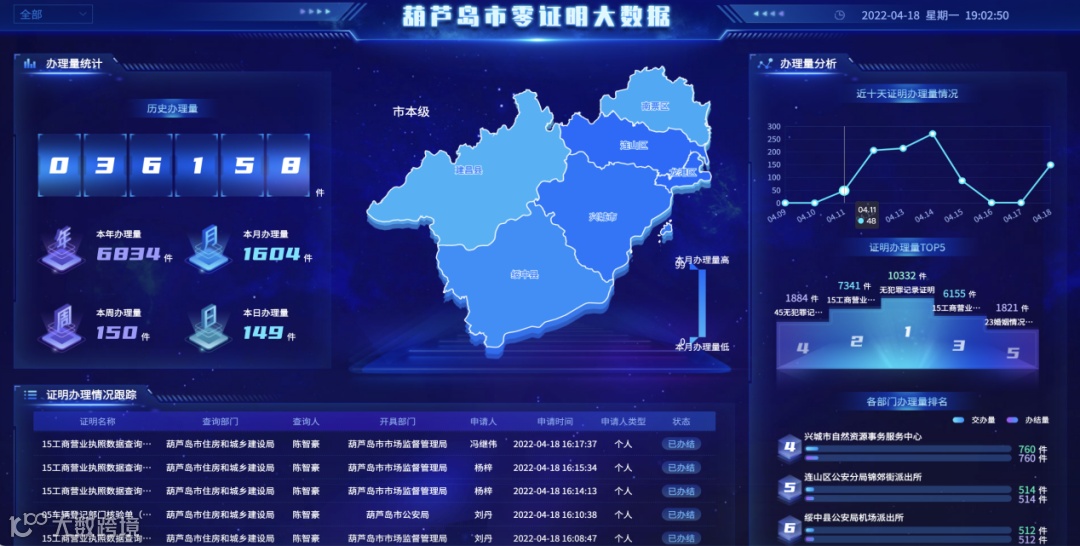 建设可视化数据展示模块,通过大屏幕对区域办件、部门办件及证明事项办理过程等情况进行集中展示,并对系统运行数据进行全方位统计分析,有效提高“零证明”数据运行监管水平,并为“零证明”创建工作决策及应用推广提供有效的数据支撑。