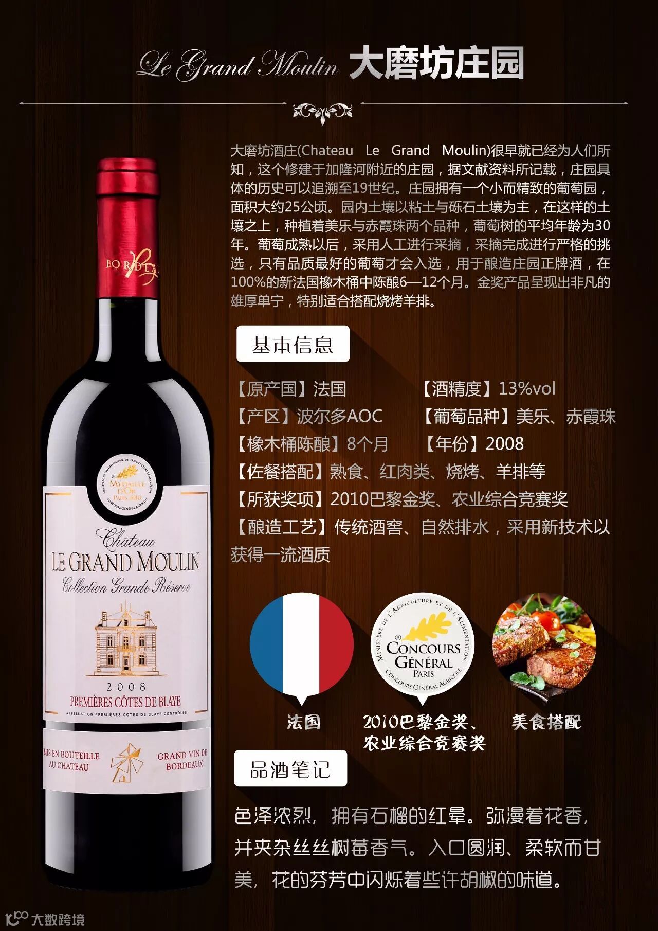 右岸的布拉伊丘与左岸梅多克产区隔河相望,名气不如右岸的两大明星--波美侯和圣埃美隆,但出产众多价格适中,质量优异的酒款,大磨坊便是其中非常闻名切具有代表性的一家。