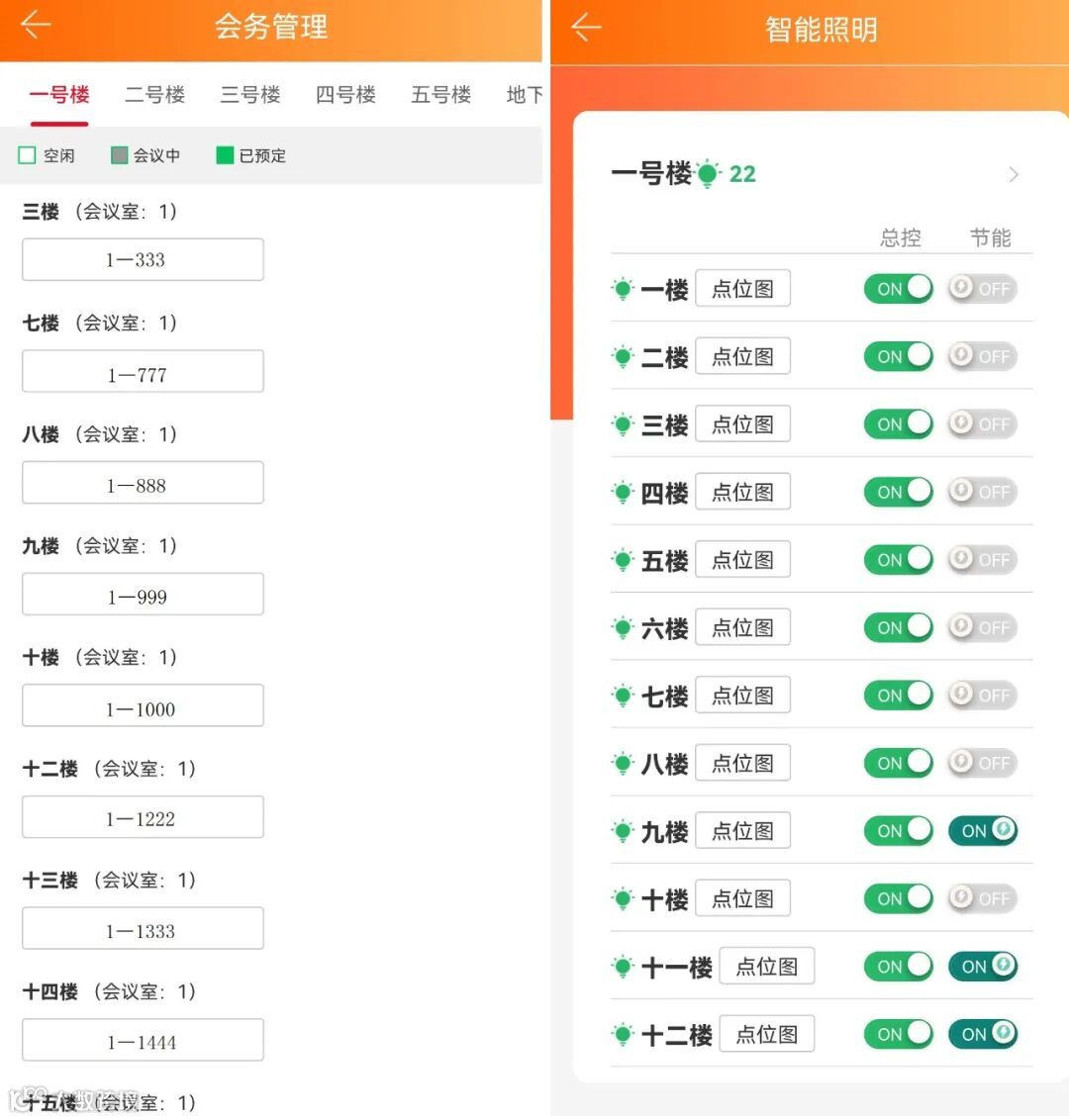 通过配备智能化的音视频会议设备,实现会议全过程无纸化,推进会议高质量开展;通过智能空调、智能照明建设,实现机关空调、照明的统一管控。机关管理人员可通过APP一键查看各楼层的设备使用情况,及时排查故障信息,并可随时随地一键控制开关,节约机关电力资源。