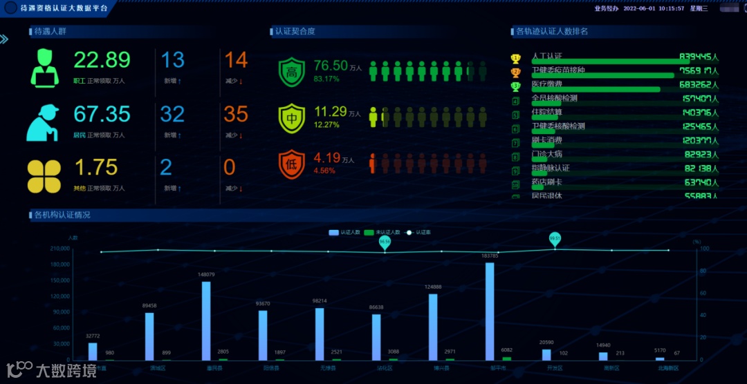 以滨州市人社局对接其他多个政务部门为例,在滨州市大数据管理服务平台的支撑下,人社局横向打破数据孤岛,共享公安、民政、医保、卫健、司法等多个部门的业务数据,借助大数据分析整合能力,分析社会保险待遇领取人员的行为轨迹,动态判断其生存状态,科学精准确认待遇领取资格,实现待遇资格“静默”认证。同时,实时触发待遇停发、恢复、追回等环节,解决社保待遇领取资格群众跑腿多、基层经办人员负担重等问题,确保了基金的安全发放。