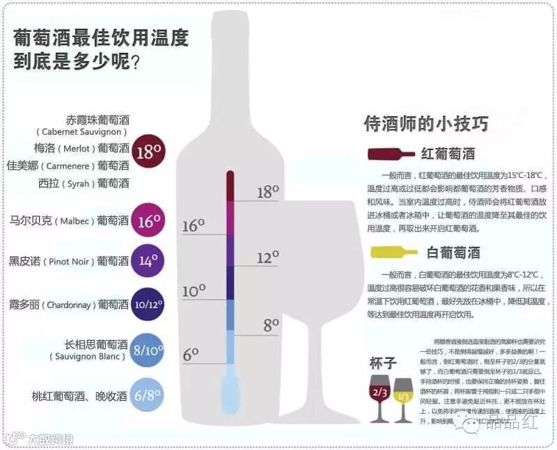 不同类型的葡萄酒,其最佳饮用温度都是有差异的。一般来说,酒体越轻盈的葡萄酒其合适的饮用温度就越低。
