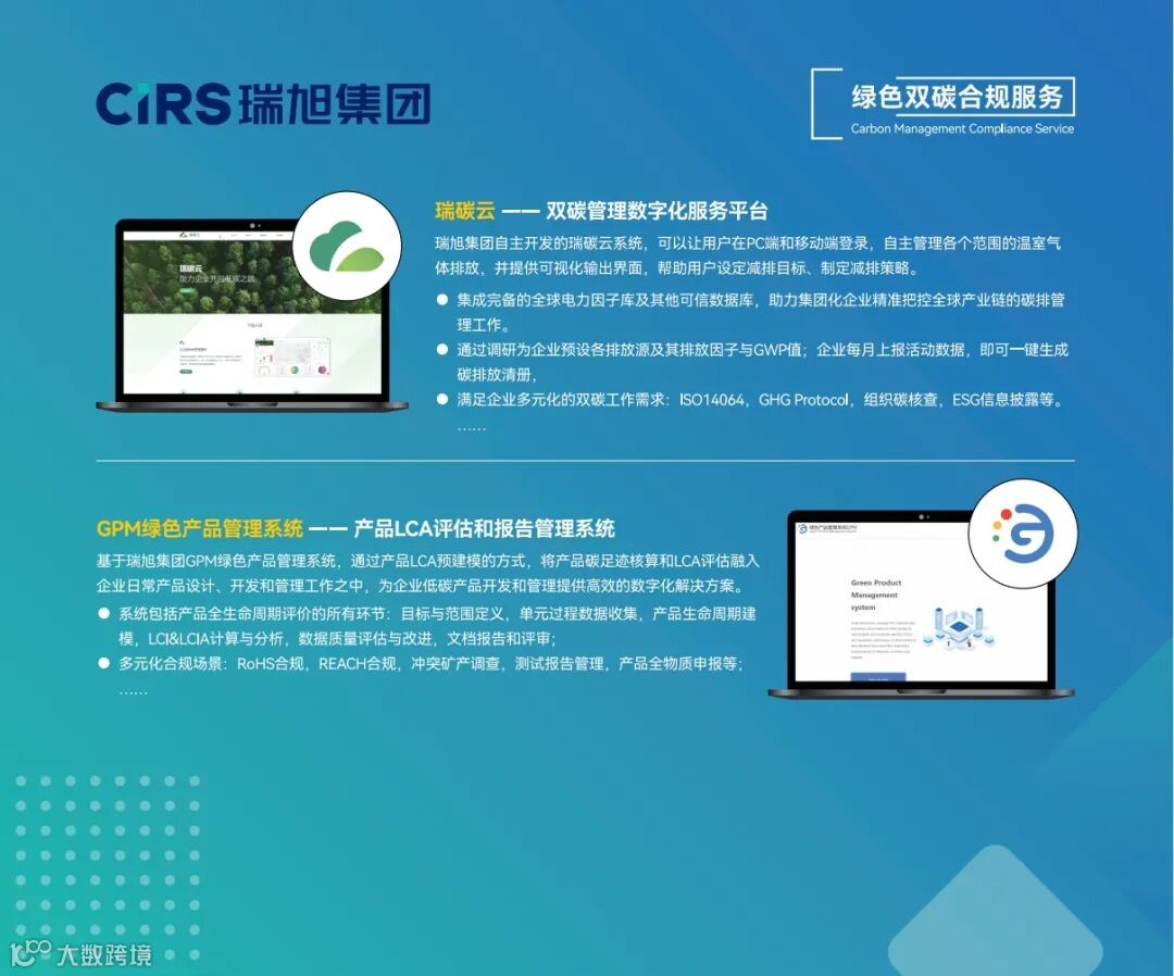 此外,我们将重点介绍我们的双碳管理软件——“瑞碳云”和“GPM绿色产品管理系统”。这些工具旨在帮助企业不仅确保产品符合市场准入要求,还能优化碳排放管理和减排策略,应对严格的环保法规,展示其在环保和可持续发展方面的行业领导力,增强品牌形象。