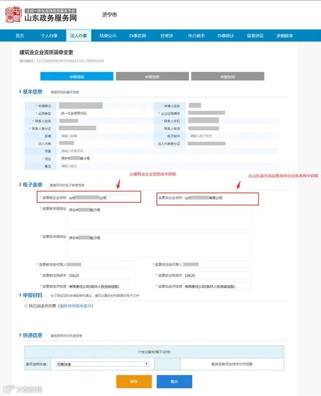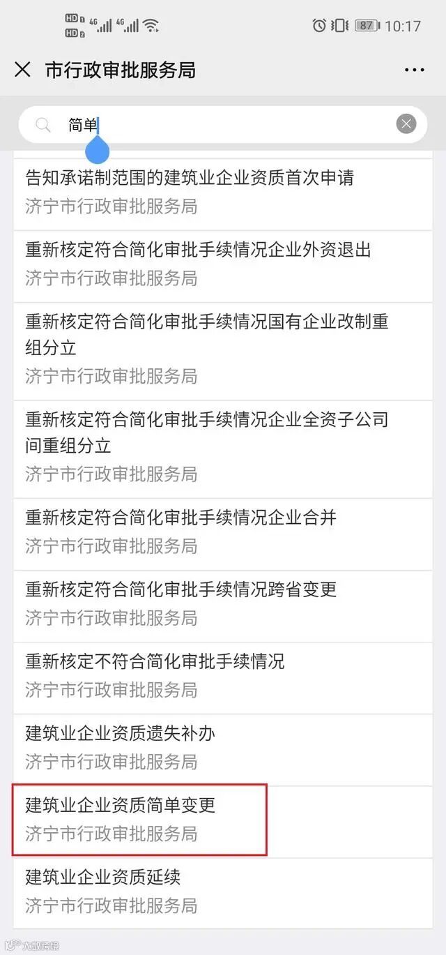 第一步:零材料申报,用山东省统一用户注册后,登录山东政务服务网(济宁),或关注济宁微信公众号,选择“建筑业企业资质简单变更”,点击申报,需要的申报信息会自动从企业资质数据库和数据共享平台获取,不需要手工上传任何材料。